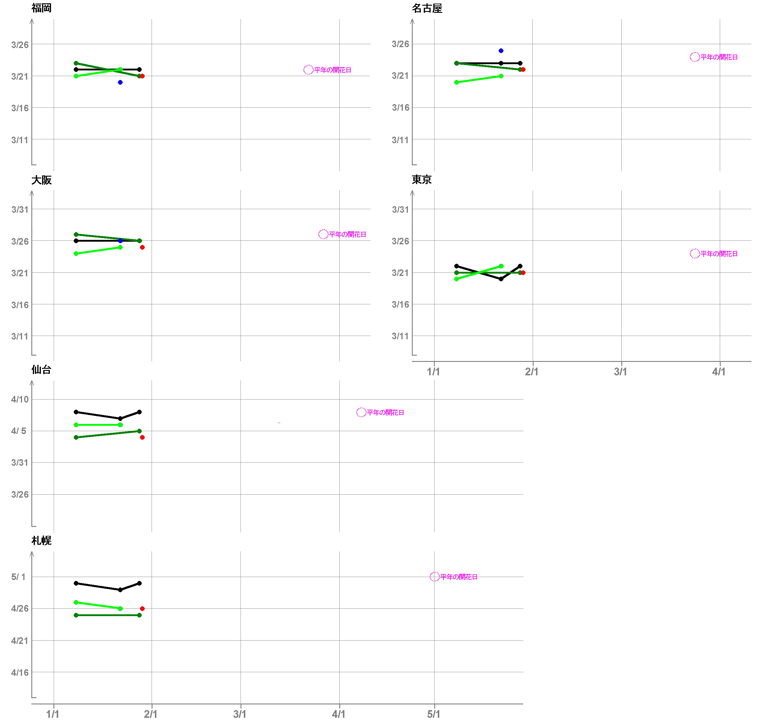| 予想された開花の日 | 3/25 | 3/21 | 3/21 | 3/22 | 3/23 | 3/21 | 3/18 | 3/17 |